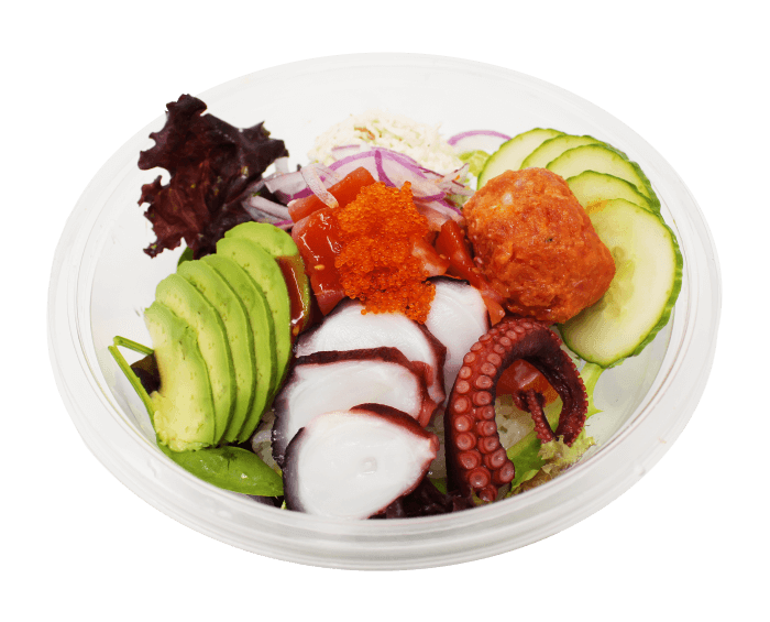 Fresh salmon, creamy mayo, crab mix, seaweed salad, cucumber, onion, fish egg and avocado