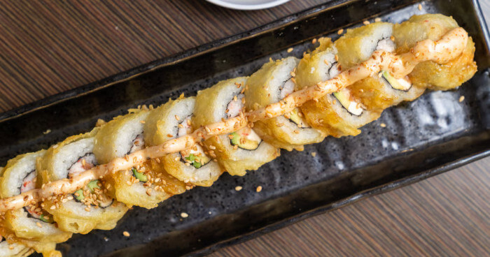 Inside: tempura shrimp , crab mix, avo, cucumber Outside: battered jalapino, cream cheese, spicy tuna