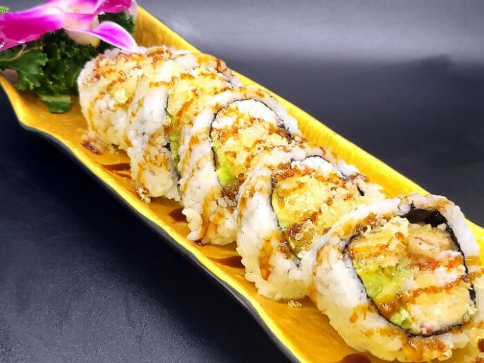 Inside: Tempura shrimp, Crab mix, avocado , cucumber Outside: Sprinkled crunch